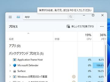 「タスク マネージャー」にフィルター機能、名前・PID・発行元などでプロセスを絞り込めるように