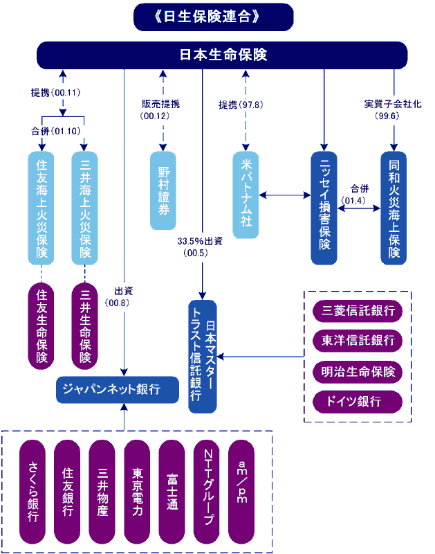 [コメント] ただ、総合保険会社への昇華を目指すうえで、損保事業の抜本的な強化は不可欠。同和火災を実質子会社化して今年4月にはニッセイ損保との合併を断行するが、力不足は否めない。住友海上-三井海上との提携もそれぞれのバックに住友生命保険、三井生命保険を抱えているだけにどこまで踏み込めるかは疑問で、決め手にはならないのが実情だ。加えて、契約者への保険金支払いなどに伴うグループからの資産流出を防ぐためには、投信だけでなく将来的にはやはり資産運用の受け皿としての《銀行》、とりわけ信託銀行が必要となろう。どの銀行グループにも属さないで、いつまで存在感を保ち続けることができるか、正念場を迎えつつある。