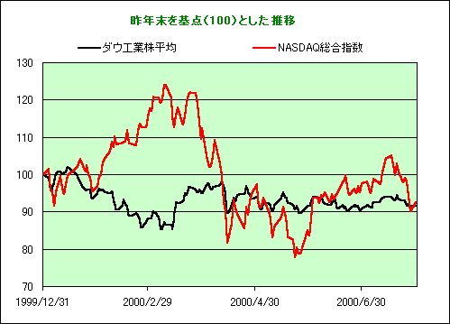 アメリカオンライン・ラテンアメリカが今週IPO予定 米国株式市場は週明けの31日、前週末の弱い地合いを引きずらずに大型テクノロジー株やインターネット株を中心に買い戻された。ダウ工業株平均は薬品株など安定株が下落した影響で前週末比10.81ドル高(0.1%高)の10521.98ドルと小反発。NASDAQ総合指数は103.99ポイント高(2.8%高)の3766.99ポイントと4日ぶりに大幅反発した。 昨年末比の騰落率は、ダウ工業株平均が▲8.5%、NASDAQ総合指数が▲7.4%とどちらも冴えない。2000年1月の終わりから3月にかけては、NASDAQが大きくアウトパフォームし、ダウと反比例の動きとなったが現在ではほぼ同等のパフォーマンスに収束したかたち。ただし、ダウは昨年末からほとんどプラス圏で推移していない。 この日1→2株の株式分割権利落ちとなったインテル(INTC)は、現在世界最速となるPentiumIIIの 1.13GHz版を発表し 2 3/16ドル高(3.4%高)の66 3/4ドルと買われた。シスコ(CSCO)、オラクル(ORCL)、アップル(AAPL)、i2テクノロジー(ITWO)なども高い。日本語版のWebサイト開設までは明言しなかったが、日本で顧客サービスセンターを開設すると発表したアマゾン・ドット・コム(AMZN)は 1/8ドル高(0.4%高)の 30 1/8ドルと反応薄。 一方、ゴールドマンサックス(GS)が今週にもセカンダリー・オファーリング(株式売り出し)を行なう予定。また、IPO(新規公開・上場)では、アメリカオンライン・ラテンアメリカ(AOLA)も今週に予定されている。1株15-17ドルで総額4億2,500万ドル規模のIPO。同社の1999年6月期の収入は160万ドル、純利益は500万ドルの損失。
