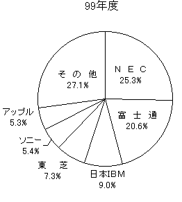 新旧交代の予感―。マルチメディア総合研究所がまとめた2000年度第1四半期(4-6月)の国内パソコン出荷データではこんな市場の図式が明らかになった。出荷台数311万5,000台(前年比42.2%増)、出荷額5,600億円(同24.4%増)と市場そのものは大きく伸びており、インターネットの加速度的な普及など、強い追い風を受けている。そのなかで、メーカー別のシェアでは不動の首位を走りつづけているNECを含め、上位3社が徐々に占有率を下げ続けているほか、1999年度には10位、5位だったソーテックとソニーがそれぞれランクを上げるなど、地殻変動の兆しが見え始めている。これまで際立った動きがなかったパソコンハードの勢力図にも大きな変化が出てきたようだ。 ●勢いづく”2S”今回発表されたシェア順位によると、1位NEC(24.4%)、2位富士通(19.1%)、3位日本IBM(8.8%)とベストスリーの顔ぶれにはまったく変更がない。ところが99年度1年間のシェアと比較すると、NECは0.9ポイント、富士通1.5ポイント、日本IBM0.2ポイントいずれもダウンしている。この結果、ベストスリーで占める全体の割合は98年度の61.3%、99年度の54.9%、今回の52.3%と下降の一途をたどっており、「50%を割り込むのも時間の問題」と見る向きもある。 これに対して、躍進したのがまずソニー。98年度にはわずか3.7%だったが99年度5.4%、今回7.1%でついに東芝を抜き5位に入ったほどだ。さらにわずか1年前の99年度第1四半期に初めてシェア1.8%で顔を出したソーテックが、昨年度1年間では3.1%、今回は4.3%にアップ。価格競争力と独自のブランド力確立で、日立、シャープ、デルなど居並ぶメーカーを一気に追い抜き8位にランクされた。今後も、いわば「2S」の攻勢が上位3社のシェアを侵食することになりそうだ。