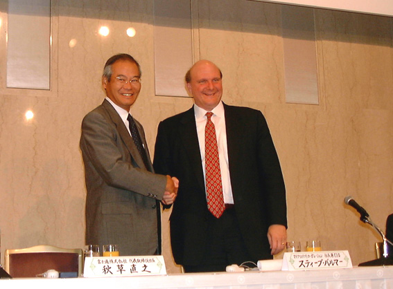 米マイクロソフトおよび日本法人のマイクロソフトと富士通(6702)は21日、秋草直之・富士通社長ら双方の首脳が都内で会見し、Windowsプラットフォームを核にした提携を結んだと発表した。マイクロソフトのWindowsと富士通のハードウェアを組み合わせ、各種のソリューションやサポートまで共同で行っていく。富士通は東京にエンジニア100人規模(初年度)の「Windowsプラットフォームセンター」を設置するほか、2001年以降、早い段階で富士通の海外関連会社である米アムダール、英ICLでも同様の展開にこぎつけたい考えだ。 マイクロソフトと富士通のこれまでの関係は、「どちらかと言えばパソコンベースのものに限っていた」(秋草社長)ことから、これを企業レベル、エンタープライズ規模にまで拡大させるのが今回の狙い。マイクロソフトが今後順次、発売していくWindows 2000ソフトウェア群やインターネットに照準を当てた「.NET Enterprise Servers」などと、富士通のハードウェアやミドルウェアをミックスして世界的なソリューション事業を進めていく。 このため富士通は、10月1日付で同社ソフトウェア事業本部内に「Windowsプラットフォームセンター」を発足させ、各種組み合わせの設計や適用検証などを行うとともに、顧客案件ベースでの3社共同作業も展開する。同センターは3年後には200人のエンジニアが常駐する予定。今後3年間で850件以上の個別システムを構築したい、としている。 米マイクロソフトのスティーブ・バルマーCEO(最高経営責任者)は「この提携は、われわれにとって単なるワンオブゼムではない。富士通の高い技術レベルと世界的な拠点網があってこそ協調関係が出来上がった」と述べた。また、秋草社長は「Windowsはすでにクライアント側のソフトウェアだけといったものではない」と指摘、Windowsベースのビジネスを3年後には現在の2倍以上に拡大させる意向だ。 ただ、米マイクロソフトにとって今回のような提携は日立製作所(6501)やNEC(6701)など、日本企業に限ってみても数多く、富士通とその他の差別化がどう行われていくかは不透明でもある。富士通も「すぐに、具体的な形で結果を出すことは無理」(杉田忠靖専務)と、数字を含む明快な見通しは避けている。