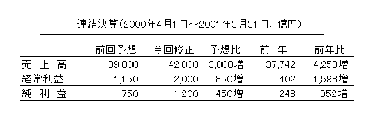 三菱電機(6503)は25日、2001年3月期の連結決算見通しの修正を発表した。IT関連の好調により、売上高が4兆2,000億円(前回予想比3,000億円増)と大幅に伸びるほか、純利益も450億円の増額修正で1,200億円となる見込み。 携帯電話関連事業が昨年から引き続いて好調なほか、パソコン需要に支えられる半導体の拡大やエアコンの需要増もあり、すべてのセグメントで当初予想を上回る売上高になるとしている。特に情報通信システムの売上高は1兆1,000億円を見込み、前期に比べて29%の伸びとなる見通しだ。