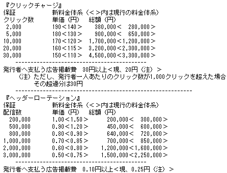 まぐクリック(4784)は29日、8種類の広告のうちクリック保証型広告「クリックチャージ」の料金を値上げするとともに、配信保証型広告「ヘッダーローテーション」の料金を値下げすると発表した。これに伴って、メールマガジン発行者へ支払う広告掲載費も改定する。新料金は11月1日以降配信を開始する受注分から適用する。 2000年12月期中間決算の実績では、全体の売上高5億6,200万円のうち、「クリックチャージ」が2億5,000万円(売上比率44.5%)だったのに対して、「ヘッダーローテーション」は1,100万円(2.0%)と差が大きく開いている。この傾向は下半期も続いており、広告主からの「クリックチャージ」の受注が消化できない状況になっているという。こういった背景から料金改定に踏み切った。 同社では料金改定によって、「クリックチャージ」の受注の減少、「ヘッダーローテーション」の1配信あたりの広告掲載費の減少の可能性は否定できないが、「クリックチャージ」については広告主の多くが未消化残を抱えている状況を考えると、メールマガジン発行者の収入増につながるのではないかとしている。