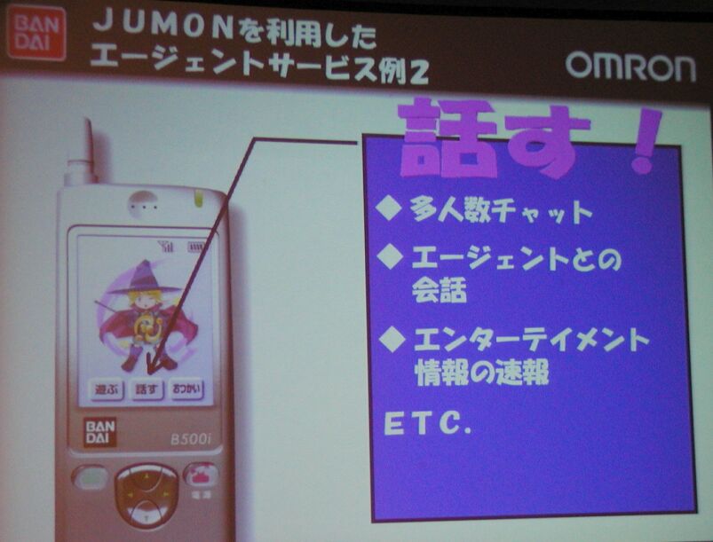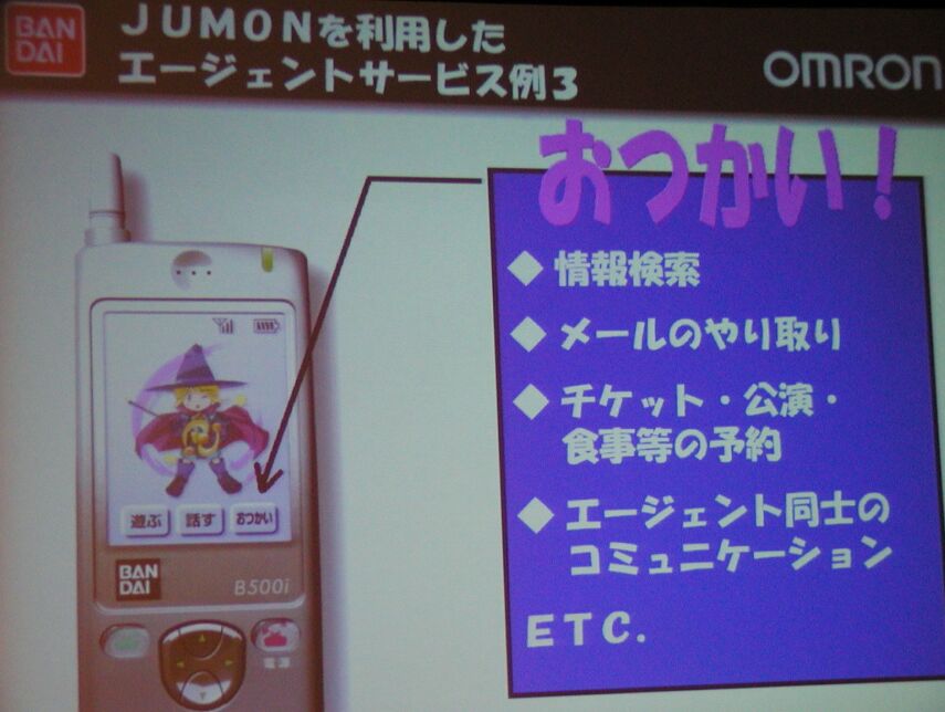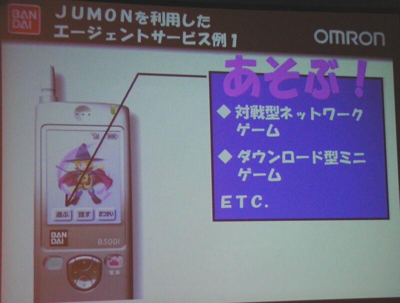 JUMONはJAVAで記述されているためOSに関係なくアプリケーションを起動できる。これまでのようにサーバーを介したやり取りではなく、端末間でのやり取りが行えるため、ネットワークゲームなどでも負荷が軽減され、レスポンスも高い。 ゲームのほかには、チケットの予約が完了するまで何度も自動的に申し込みを行うことをエージェントに命令したり、知りたい情報をエージェントに自動的に取りに行かせたりすることなどの使い方ができる。 将来的には、JUMON搭載端末では異なる通信規格(実行環境)を採用する通信事業者の端末同士でもコンテンツを楽しむことができるようにしていく。さらに、無線データ通信のブルートゥースにも対応していくかまえ。 来春を目標にエンターテインメント系のコンテンツを4~5つ展開していく予定。ただ、パケット料金を最小におさえるよう開発を進めているものの、JUMONが自動実行で働く場合もあるため課金のやり方は検討しなければならず、現在通信事業者などと話し合っているという。 一方、バンダイネットワークスはバンダイ(7967)が2000年9月7日に100%出資で設立したコンテンツ配信サービス企業で、携帯向電話向けコンテンツの有料加入者数は270万人を突破している。同社は、9月に札幌の情報セキュリティ技術開発会社オープンループの第3者割当増資の一部を引き受けている。 高橋豊志取締役は「おそらくJUMONのコンテンツ開始時には会員数は400万人規模になると考えており、JAVAのセキュリティもあるがユーザー情報の漏洩などが無いように念を入れるためオープンループもこの事業に参画することになるだろう」と述べた。オープンループとバンダイネットワークスは、今回の事業以外でも幅広く協力していくという。