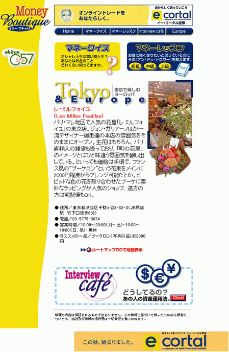 11月中旬の取引サービス開始に向け準備を進めている欧州系初のオンライン証券会社イー・コータル証券は30日、東芝(6502)が運営している情報サイト「駅前探検倶楽部」の事業パートナーとなり、金融情報「ekitan C57 Money Boutique (マネー・ブティック)」を開設、10月31日からサービスを開始すると発表した。 「駅前探検倶楽部」は、時刻表に連動した乗換え案内や駅周辺情報など外出する際に必要な情報を提供しており、1日16万人以上のアクセスと200万ページビューを誇る。このWebサイト内に働く女性向けのライフスタイルサイト「ekitan C57」が展開されており、今回の金融情報はここで提供される。 用語解説などの「マネーレッスン」や、著名人の資産運用のノウハウをインタビューする「Interview Cafe」などのコーナーがあり、金融用語や金融商品に親近感をもってもらい、オンライントレードの新規顧客の開拓につなげる。 同証券では、今後も様々なWebサイト運営会社やカード会社などとパートナーシップを組んで展開していく構えだ。