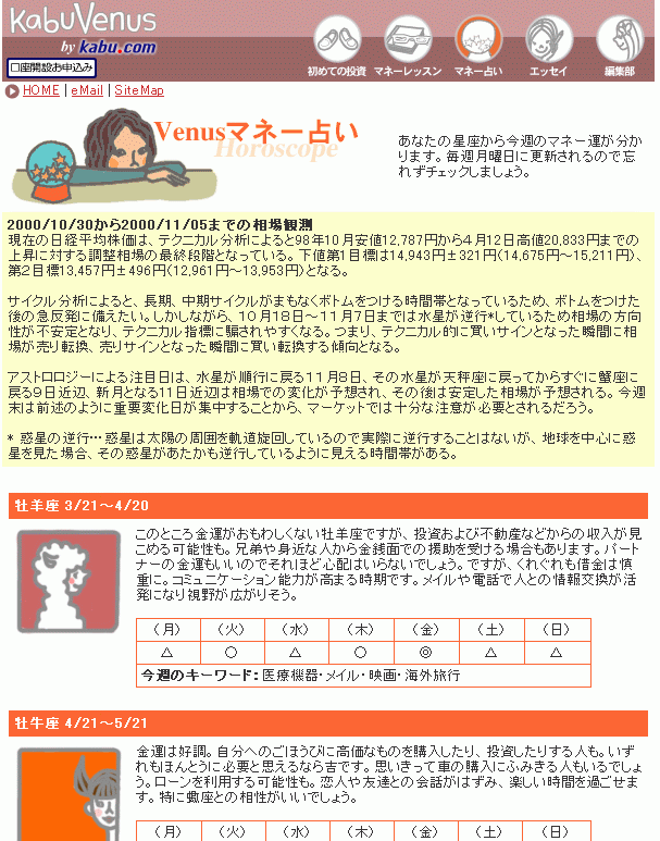 日本オンライン証券は、女性向けに投資情報を提供するWebサイト「Kabu Venus(カブビーナス)」を6日に開設する。同サイトの企画やコンセプトなどは、商品開発やマーケティング、コンサルタントなどを手がけるビートと共同で進めたもの。サイトの運営などは日本オンライン証券の女性社員が行い、女性の株式や投資への関心を高めることを狙う。 投資初心者向けの解説やコラム、マネー占いなどを提供する。具体的には、国際占星学研究協会会員の丸山あゆみ氏によるマネー星座占い、ソフィアバンク シニアプロデューサーの藤沢久美氏によるマネーコラム、フィナンシャルプランナーで同証券の社員の松山智彦氏の資産運用相談がある。 また、ビートの展開するWebサイト「美・構図」でも「Kabu Venus」へ誘導する連携サイトを立ち上げる。