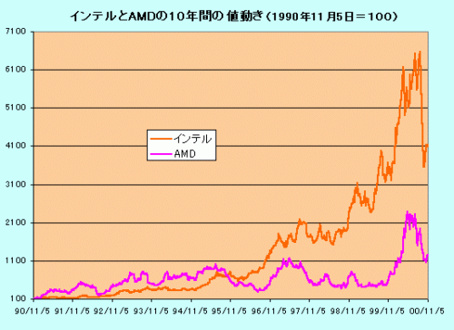 これまでは売上げが安定していなかったが、製品に対する評価は高く、搭載PCも実際に市場投入され始め、これからが本格的な事業展開となる。まずは、黒字転換がいつ頃で、それをどのように株価に織り込んでいくかが注目される。 ちなみに、インテルとAMDのここ10年の値動きを比較すると、1990年代前半の約5年間はAMDがインテルをアウトパフォーム(AMDの上昇がインテルの上昇を上回る)し、直近5年間は逆にインテルが大きくAMDをアウトパフォームしている。 両社とも今年8月には大きく値を崩しているが、この時期はトランスメタが上場を申請したときだ。インテルもAMDも同社に脅威を感じており、今後どのように対抗してくるかも注目されるが、性能や価格面で優位が続けば両者をアウトパフォームすることも不可能ではなかろう。