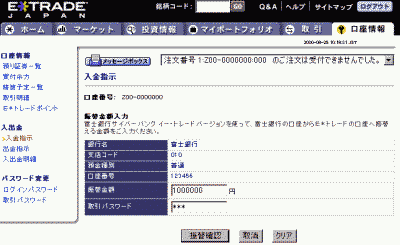イー・トレード証券(8627)は富士銀行と提携し、Web上からリアルタイムで資金移動の指示が可能になる資金決済システム「富士サイバーバンク E*トレードバージョン」を2001年1月中旬から開始する。