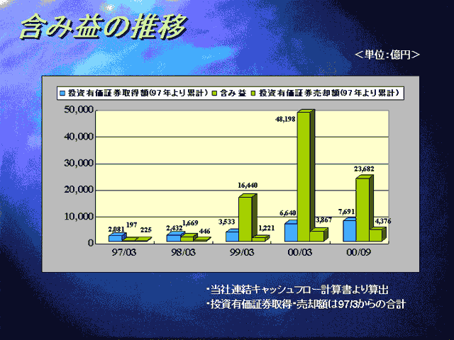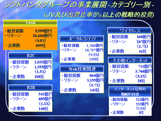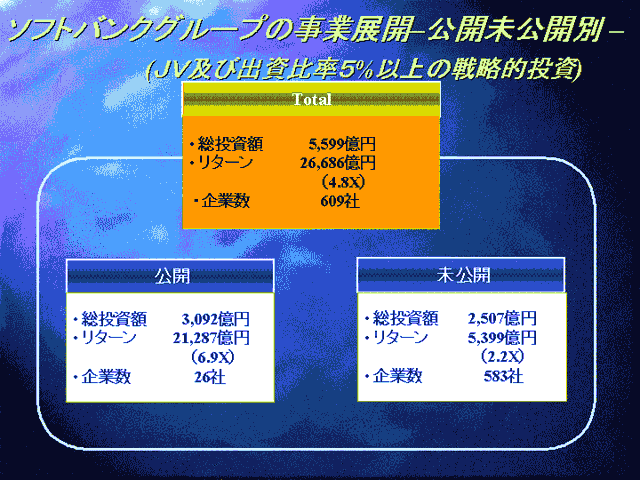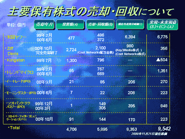 また、トラッキング・ストック(業績連動株)にも触れ「ZDネットでトラッキング・ストックを発行した経験を持つが、中間持ち株会社の株式公開・上場を中止したのはトラッキング・ストックを発行する方法を選んだからではない」と述べ、「トラッキング・ストックにしても普通株にしても、どうしても少数株主ができてしまい経営資源の効率を考えるとソフトバンク本体が資金(現金)を得て再配分したほうが良いと判断したため」と説明した。
