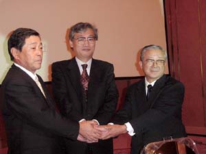 NECの杉原瀚司専務(左)、エルピーダメモリの 徳山賢二社長(中央)と日立の石橋正専務 |