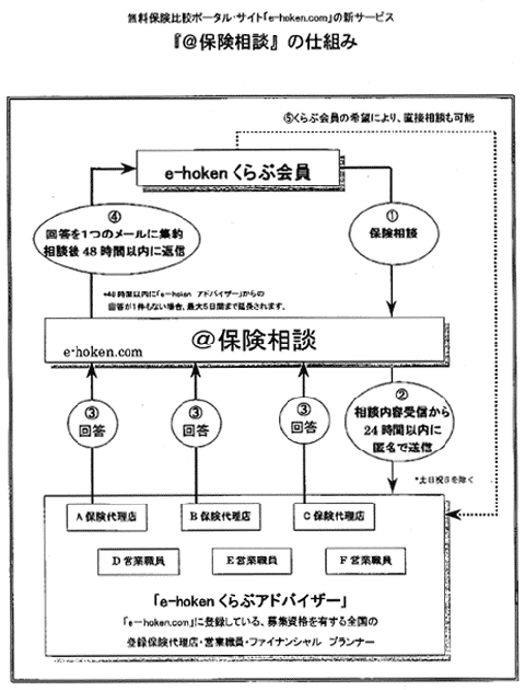 保険の募集資格を有する全国の保険代理店や営業職員、ファイナンシャル・プランナーから「e-hokenくらぶアドバイザー」の登録を募り、ユーザーが個々の疑問や質問を同アドバイザーに相談できる場を提供。ユーザーは、事前に「e-hokenくらぶ」に無料会員登録後に相談内容を「@保険相談」に送信すると全国の保険のプロから複数の情報・回答が得られるという仕組みになっている。相談内容はアドバイザーに匿名で送信されるため個人情報が利用されたりすることは無いという。