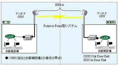 周波数は22ギガヘルツ。提供区域内で2km以内の離れた2地点を1対1型でダイレクトに結ぶ。比較的近距離にある事業所などの間で大容量のデータ通信を行いたいなどのニーズに対応する。