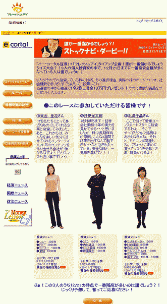 このコンテンツでは、3人の投資家がダービー出場者として登場し、約1カ月間特定の銘柄に投資する。1カ月後、3人のうち誰が最もリターン(収益)を得るかをユーザーに予想してもらい、正解すると商品がもらえる。3人は、Web上でアセットアロケーション(資産配分)やポートフォリオをすべて公開している。全部で6回開催する予定で、第1回の開催期間は12月1日から21日まで。投票の締め切りは15日まで。