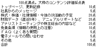 選定は、10月1日から11月24日の期間にわたって、主要上場・公開会社400社のWebサイトのIRページをレビューし、株価や財務データ、アナリストミーティングなど各コンテンツ評価項目を100点満点で採点した。