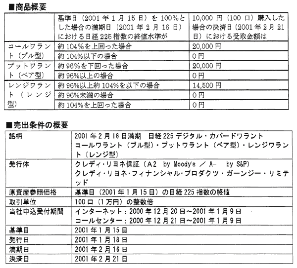 イー・トレード証券は、クレディ・リオネ証券が提供する「2001年2月16日満期 日経225デジタル・カバードワラント(愛称:マーケット・ファイヤー)」の取り扱いを開始した。