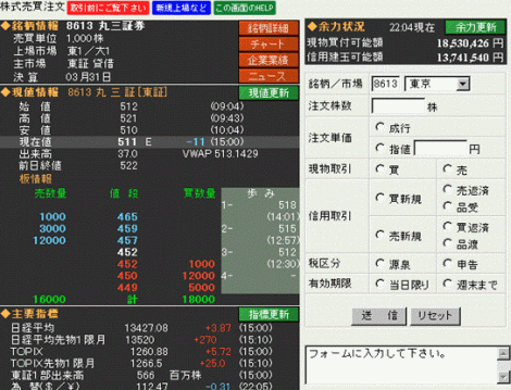 丸三証券は、オンライントレード「マルサントレード」の株式注文画面を大幅に刷新した。銘柄情報や余力情報(買い付け可能額)、3本気配値の板情報など、投資に必要な情報を注文画面に集約させた。この注文画面を中心に実際の取引や情報の入手が行える。