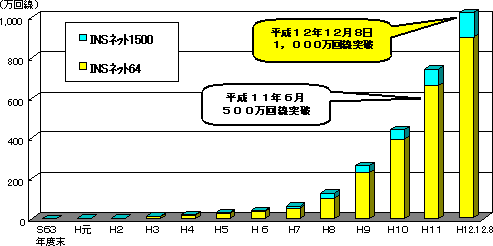 東西のNTTは26日、全国で展開している「INSネットサービス」が12月8日に1,000万回線を突破した、と発表した。1988年に東名阪で事業を開始して以来、12年目での達成となった。1999年6月に500万回線をクリアし、それからわずか18カ月で大台を超えた。