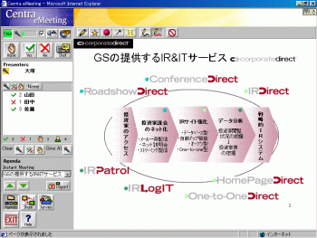 このうち、「カンファレンスダイレクト」ではロータス・ノーツの開発者が設立したセントラ社のソフトウェア「Centra eMeeting 3.0」を利用して主催者と参加者の双方向コミュニケーションを実現させている。主催者側ではこのソフトウェアを使うが、参加者側では基本的に一般的なPC、インターネット接続環境とブラウザーがあれば特別なソフトウェアは必要ない。アイコン表示によって参加者が挙手したり、発言することなどが可能。
