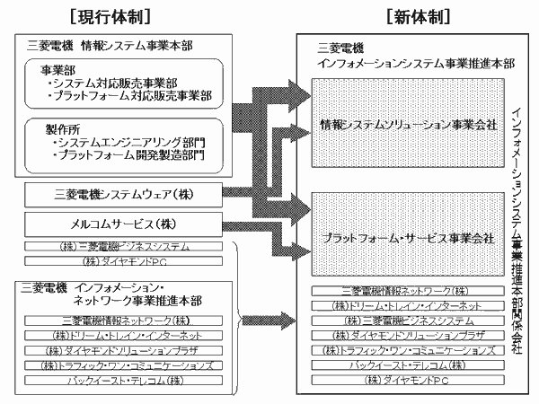 機構改革の内容は別表の通りで、大元となる「インフォメーションシステム事業推進本部」を設置し、IT関連事業部隊を集約する。新会社として情報システムソリューション事業会社とプラットフォームサービス事業会社を設立させ、現在の三菱電機情報システム製作所、メルコムサービスなどを統合する。