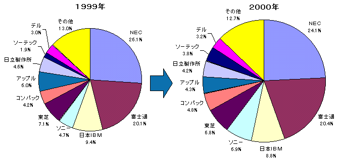 メーカー別のシェアは、319万台(同22.2%増)を出荷したNEC(6701)がトップを維持したものの、24.1%で前年より1.9ポイント落とした。逆に2位の富士通(6702)は0.3ポイント伸ばして20.4%とした。また、前年比でほぼ倍の91万台を出荷したソニー(6758)は6.9%を確保、前年の6位から4位に躍進した。店頭売りが伸びているソーテック(6829)は3.8%で9位と、初めてベストテン入りしている。