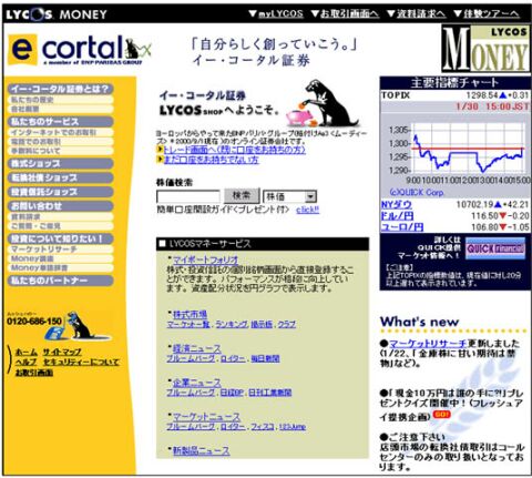 イー・コータル証券は1日、ライコスジャパンと協力し金融情報コンテンツ「LYCOSマネー」を同証券のWebサイトに組み込んだ「イー・コータル証券ライコスSHOP」を開設したと発表した。