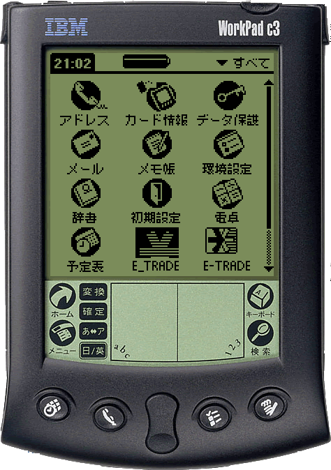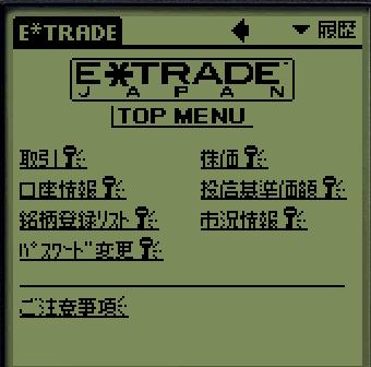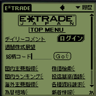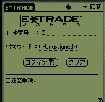 利用するには、イー・トレード証券の「Web Clipping Application」をダウンロードして、Palm端末にインストールしなければならない。イー・トレードのアイコンがトップ画面に現れ、ここからサービスメニューに入っていく。