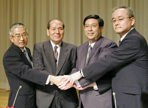左から 牧野明 大和生命社長 野々宮恵司 あざみ生命社長 北尾吉孝 SBF社長 梶川朗 あざみ生命副社長