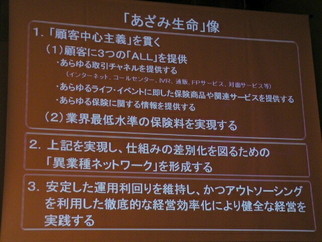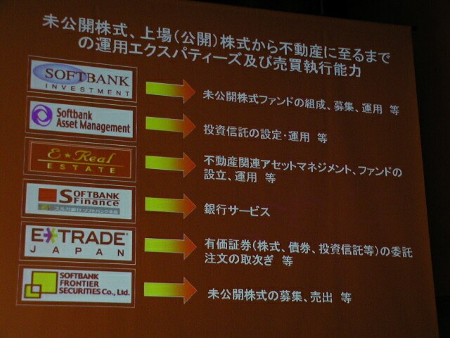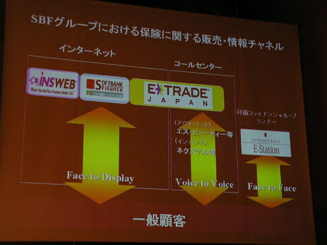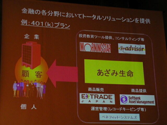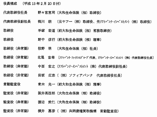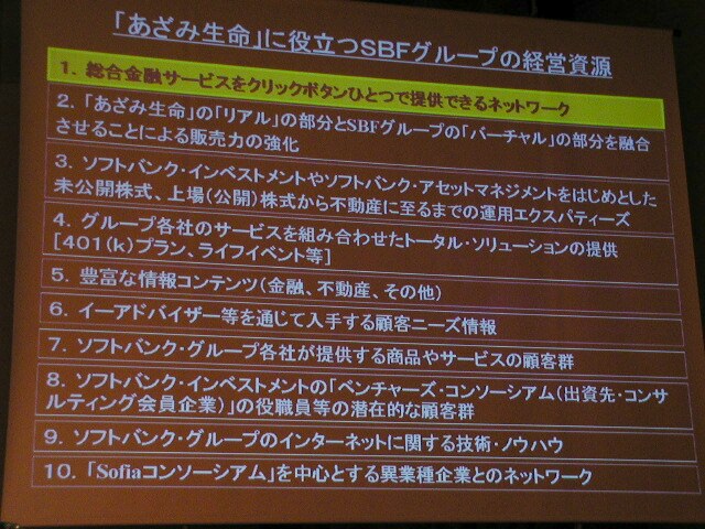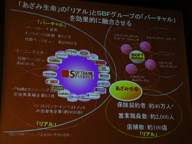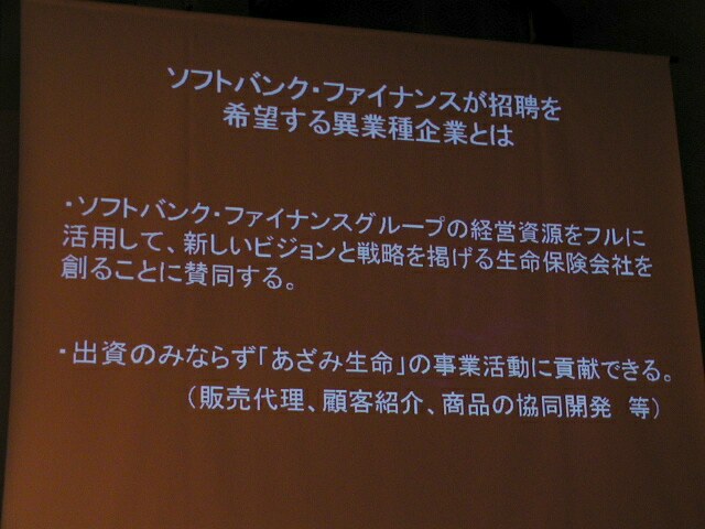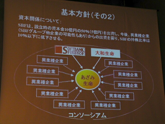 一方、ソフトバンク・ファイナンスの北尾吉孝社長は保険業参入について「日債銀の時のように機関生保化と報道機関などから批判を浴びることだけは決してないよう単独での生保買収は考えなかったが、野々宮社長から異業種連合構想を聞いてこれならばソフトバンクのスタンスやスタイルに合うと判断して協力を決めた」と経緯を説明した。協力については「グループ経営資源の提供をはじめ全面的に協力し、あらゆる取引チャネル、サービス、情報を顧客に提供することで差別化を図り、業界最低水準の保険料を実現させる」と述べた。