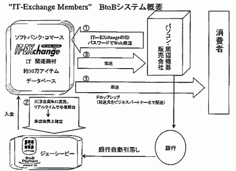ソフトバンク・イーコマースの100%子会社でIT商品流通事業を手がけているソフトバンク・コマース(SBC)は26日、クレジットカードのジェーシービー(JCB)と法人向け代金決済サービスで提携したと発表した。Web上で商品検索や受注・納期管理が行えるSBCのシステム「IT-EXchange」とJCBの与信・決済システムを統合した新システムを共同で構築し、今後このシステムを活用した中小規模のパソコン・周辺機器販売会社を対象とした法人向け代金決済サービス「IT-EXchange Menbers」を4月1日から開始する予定。年会費は無料で、支払いは毎月15日締めの翌月10日払い。