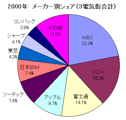 メーカー別のシェアは、NEC(6701)が22.0%でトップを維持したものの、2位ソニー(6758、16.2%)との差は、前年の8.1ポイントから5.8ポイントに縮まった。ソニーは、店頭での実売が14万円を切るデスクトップ型や、17万円を切るノート型の投入で販売を伸ばした。電気街の販売ではNECに次ぐ第2勢力としての地位を固めた格好だ。