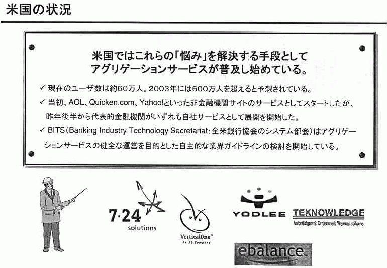 アグリゲーションサービスは、米国で1999年の初め頃に登場し、現在のユーザー数は約60万人、2003年には600万人を超えると予想されているという。しかし、米国の場合はWeb上の情報を無断で収集するサービスが多い。今回の日本でのサービスでは、こういったやり方ではなく、パートナーシップをとるかたちで進める。