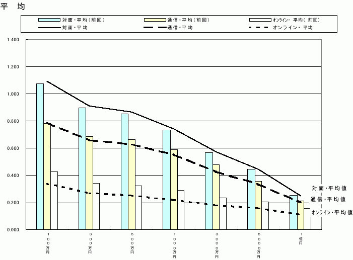 それぞれ取引形態別に約定代金ごとの手数料率を比較すると、前回調査時と同様に全体的には対面取引、通信取引、オンライン取引の順に低くなっている。平均でみると対面取引に対して通信取引は8割程度、オンライン取引は4割程度になっている。