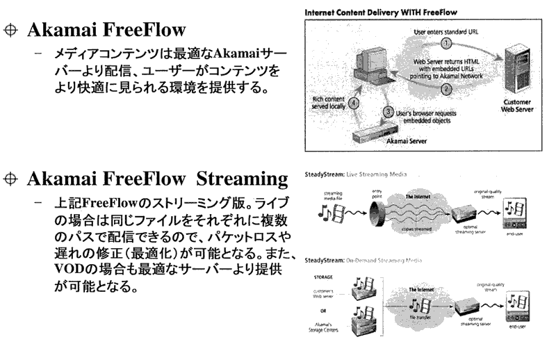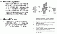 具体的なサービスとしては、(1)Akamaiサーバーから最適化されたコンテンツを配信しユーザーが快適に利用できる環境を提供する「Akamai FreeFlow」、ビデオ・オン・デマンドなどライブや録画のストリーミング・データを複数の経路で配信、パケットロスや遅延による配信ミスを防ぐFreeFlowのストリーミング版「Akamai FreeFlow Streaming」、指定時間にコンテンツを自動更新する技術とネットワーク管理技術をパッケージ化した「Akamai EdgeSuite」、スライドショーやストリーミングメディア、ユーザー登録、Q&Aなどを統括するオンラインプレゼンテーションやライブイベントのバックエンドサービス「Akamai Forum」の4本を日本でも提供していく予定。