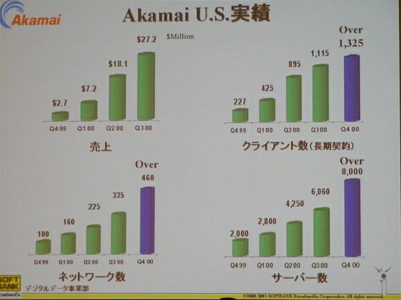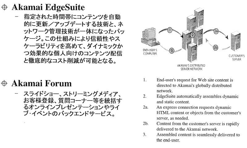 アカマイの顧客は(1)放送・出版メディアなど大手コンテンツ提供会社(2)情報検索をはじめとするポータルサイト運営会社(3)一般企業―を対象に、これらのエンドユーザーが顧客企業のサイトにアクセスする際「Akamai」技術を使ってコンテンツ配信を2~10倍に高速化し、信頼性の向上も図る。「Akamai」は応用数学を用いて配信の最適化を行うことでアクセス渋滞を回避することが可能。Akamaiのネットワークは世界55カ国以上にサーバーを8,000台以上設置し、473社の通信ネットワークと直結している。米国での顧客企業数は3,600社以上あり、米国大統領選挙でCNNのWebサイトにアクセスが集中したときでもサーバーがダウンしなかったことで有名。