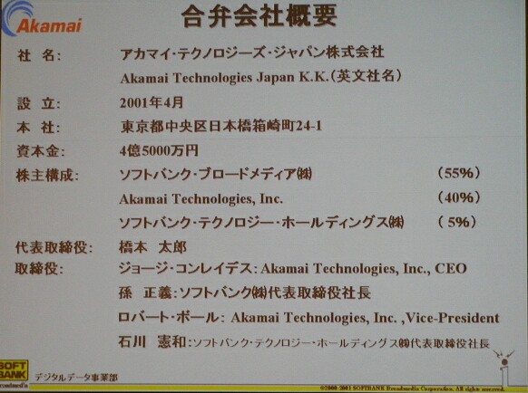 合弁会社の資本金は4億5,000万円で、出資比率はSBBが55%、Akamaiが40%、SBTHが5%。社長には橋本太郎SBB代表が就任し、取締役にはジョージ・コンレイデスAkamai代表、孫正義ソフトバンク代表、ロバート・ボールAkamaiヴァイスプレジデント、石川憲和SBTH代表がそれぞれ就任する。