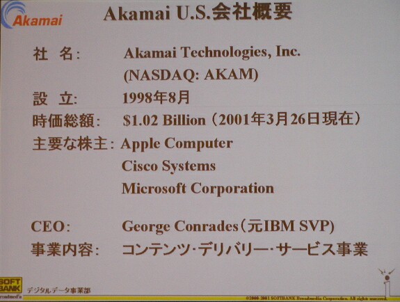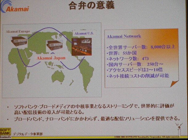 ソフトバンク(9984)グループにおける放送・ブロードバンドメディア関連の事業統括会社ソフトバンク・ブロードメディア(SBB)、米国Akamai、ソフトバンク・テクノロジー・ホールディングス(SBTH)の3社は28日、インターネットコンテンツの配信を高速化する技術・サービスを日本で展開する合弁会社「アカマイ・テクノロジーズ・ジャパン」を4月に設立すると発表した。