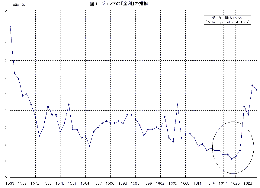 (筆者注:資料:A History of Interest rates:S.Homer、なお、ここでの金利は今日の概念では短期金利に分類される性格のものである。また偶然ではあるが、3月25日付の『日本経済新聞』「中外時報」にもジェノアの低金利とその後について書かれているので、併せてご参照されたい)。