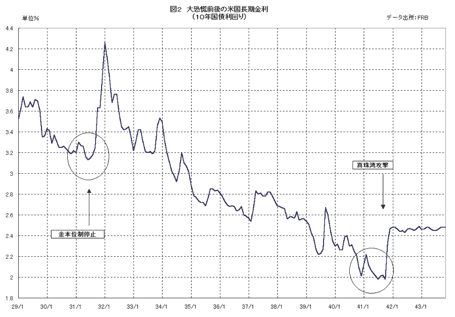 次の事例は1931-1941年の米国である。図2はその間の米国長期金利の推移で、大恐慌による景気低迷を背景に1931年以降、10年にわたって低下した後、日本の真珠湾攻撃によって底打ち、上昇に転じた様子が見て取れる。