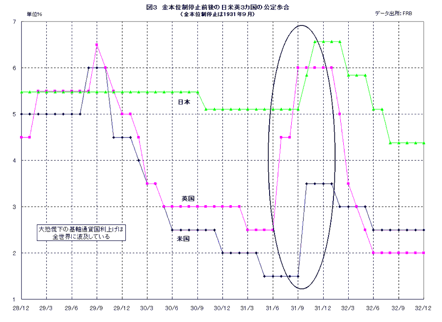 1931年5月、資産内容の悪化が噂されていたオーストリアのロスチャイルド系大手銀行が倒産し、同年7月には隣国ドイツにも金融危機が飛び火している。この両国には英国が多額の投資を行っていたが、このことに不安を感じたフランスや米国は外貨準備として英国に預託していたポンドを一斉に金に兌換し始め、英国が手持ちする金はほぼ底をつく事態となった。これに対して米国など主要国は英国に緊急融資を行ったものの焼け石に水で、その結果、31年9月に英国は金本位制の停止(金とポンドの兌換停止)を余儀なくされてしまう。金の裏付けを失った基軸通貨は、単なるペーパーマネーでしかない。このため英国は直ちに公定歩合を4.5%から6%に引き上げ、ポンド防衛に踏み切らざるを得なかった。この基軸通貨国の利上げはすぐさま全世界に波及し、短期間に米国は1.5%から3.5%へ、日本も5.11%から6.57%へと公定歩合を引き上げている(図3)。