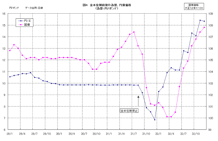 すなわち、現在と同様に昭和初期の不況下でも資金需要の低迷から内外債券への投資が激増していたのであるが、「金本位制停止」を境にポンド安円高、及び内外金利の上昇という具合に状況が一変し、銀行はポンド建て為替の差損発生、公社債、株価の暴落といった大打撃を被るはめになったのである(図4)。それでは、こうしたダメージを世界的規模でもたらした「金本位制停止」とは、一体どんな出来事であったのか。