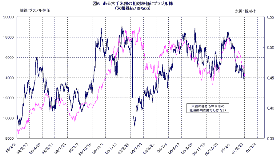 米国経済のアキレス腱は中南米にある。大手米銀の相対株価が中南米の株価指数と連動していることはその証左である(図5)。それだけに最近の株価暴落の影響が中南米経済を直撃するようならば、経常赤字の埋め合わせを海外マネーに頼る米国自身に金融危機が跳ね返ってくることは必至である。具体的には、米国金利の上昇や株価の下落を通じてドルの動揺につながっていくわけで、これは1930年代の基軸通貨国、英国を危機に陥れた金の流出が、形を変えて再現することを意味する。