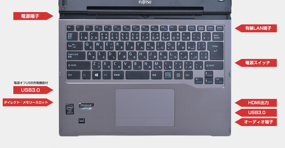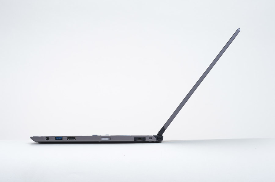 インターフェースが充実していることも特筆できる。右側面に、有線LANとUSB 3.0、HDMI出力、ヘッドセット端子が用意されており、左側面には、USB 3.0とSDメモリーカードスロットが用意されている。有線LANは、通常のコネクタだと厚みが大きいため、薄さ重視のUltrabook™には搭載されていないことが多いが、TH90/Pでは、引き出し式コネクタを使うことで有線LANの搭載を可能にした。家庭などでは無線LAN環境が整っていることが多いが、出張時に持って行く際など、ホテルの部屋には有線LAN経由でのブロードバンド接続サービスしか用意されていない場合も多い。そうしたときでも、TH90/Pなら、他にアダプタなどを用意せずに、ブロードバンド接続サービスを利用できるので、ビジネス用途にも適している。また、ワイヤレス機能も充実しており、IEEE 802.11a/b/g/n準拠の無線LAN機能とBluetooth v4.0+HSに対応している。