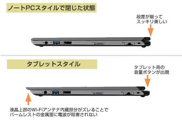 これまでもこうした2軸ヒンジを備えた製品は存在したが、ディスプレイを回転できる方向が左右どちらかのみだったり、ノートPCスタイルで液晶を閉じた時に、後面のヒンジ部にコンバーチブル特有の段差ができてしまっていたが、TH90/Pはディスプレイを左右どちらにも回転できるうえにデザインにもこだわっており、「Shift Hinge」構造により、後面のヒンジ部に段差のない、すっきりとした外観を実現している。