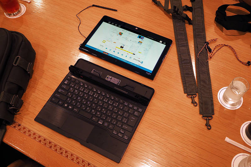 打ち合わせ相手の反応がちょっとおもしろかった。ノートPCスタイルから画面部分(タブレットPC本体)をスコッと抜いてテーブルに置いたら「えっえっナニなに何?」と。こういうタイプのPCを見たのは初めてだった模様。「画面の部分だけでも使えて、その部分は防水防塵なんですよ」と言ったら、「えーっ、買おうかな。どこのパソコンですかそれ?」とも言っていた。