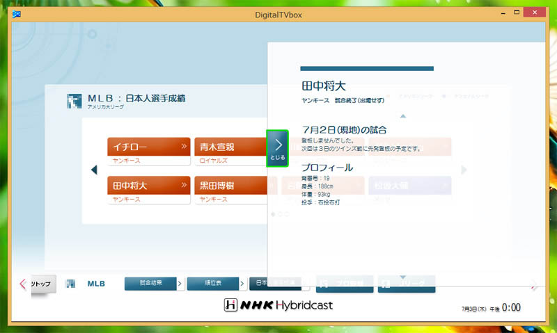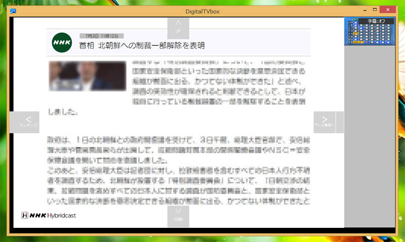 FH78/RDでは、7月にリリースされた最新版のテレビアプリ「DigitalTVbox」のアップデートでHybridcastに対応した。7月現在、HybridcastはNHK総合テレビのみが本格サービスを開始しており、その他の民放などは一部の番組で試験的に実施しているのみ。とはいえ、大型テレビでも一部機種しか対応していないHybridcastを、PCであるFMVで体験できるのはうれしい限りだ。