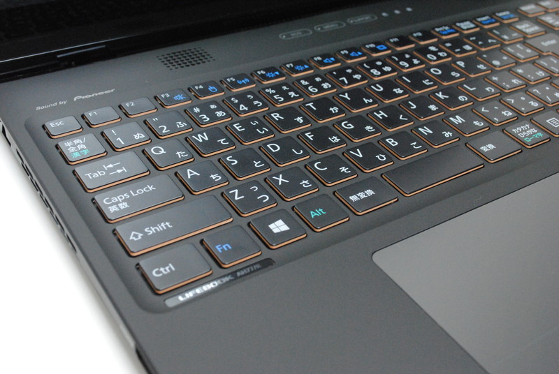 パッと見ただけではわからないが、AH77/Rのキーボードに触れてみると、各キーが液晶側に向かってわずかながら傾いていること、そしてキートップの中央部分がくぼんでいることに気付く。