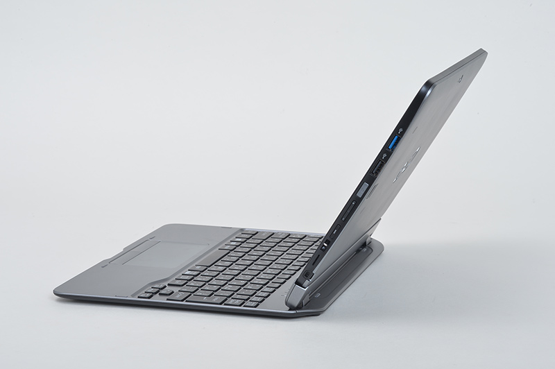 なので、デスクで仕事する時など快適に長文テキストを入力したいケースでは、カシャッと合体させて普通のノートPCのように利用でき、持ち歩きたいときや純粋にタブレットとして使いたいときはサクッと外してスタイリッシュに使うことができる。装着時でもクラムシェル型に折りたためるから、持ち運ぶ場合でも合体させたままフツーにモバイルPCとして使えるだろう。