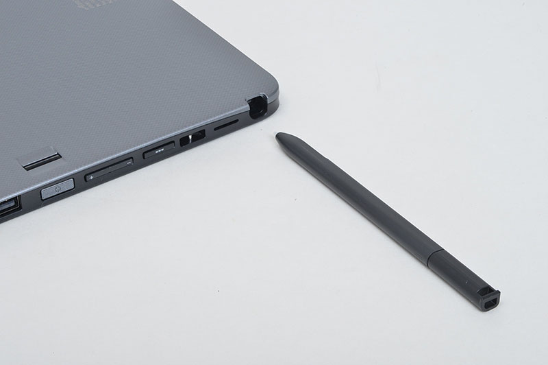 もう1つの特長は、旧モデルから継続して専用スタイラスペンが付属していること。ペンは本体右下側面から引き出して使うことができる。「タッチできるなら別に使わなくてもいいんじゃない」なんて思ってしまうかもしれないけれど、意外にこのスタイラスペンが重要なのだと訴えておきたい。