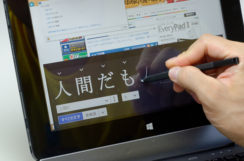 まず、ペンの場合はタッチより精度高く描画できる。ペンの方が指先より細いから狙ったところをタップしやすい、という単純な話ではなく、実際にペイントソフトなどで書いてみるとわかるのだが、曲線が指でタッチするより明らかに滑らかに描かれるのだ。細かい文字や絵を正確に書けるのはもちろんのこと、Windows標準のソフトキーボードが備えるテキストの手書き入力時にも、この精度の差は少なからず影響してくるだろう。