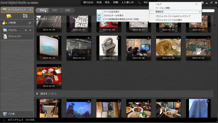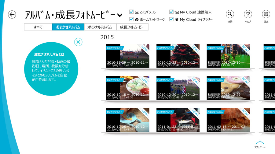 「My Cloudプレイ」では、取り込んだ写真や動画を自動的に撮影日付順に整理し、月や年のカレンダー形式で表示することが可能なほか、撮影日や位置情報を元にイベントごとの「おまかせアルバム」が自動的に作成される。ゴールデンウィークで長めの旅行に出かけた時の写真が整理しきれなくて……というときも、自動で整理してくれるのがうれしい。